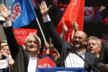 epa04187692 Democratic Left Alliance (SLD) leader Leszek Miller (L) and Martin Schulz (R), top candidate of the Party of European Socialists (PES) for the European elections, during the May Day rally organized by Democratic Left Alliance and All-Poland Alliance of Trade Union in Warsaw, Poland, 01 May 2014. Later demonstrators march through the streets of Warsaw. Labour Day, also known as International Workers’ Day or May Day, is observed worldwide on 01 May. EPA/TOMASZ GZELL POLAND OUT