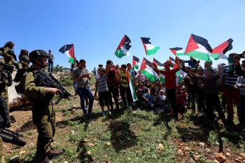 epa04163362 Palestinian protesters wave Palestinian flags in front of Israeli soldiers during clashes against the Jewish settlement of Alone More, near Nablus, West Bank, 11 April 2014. Three Palestinians were reportedly wounded during a demonstration against Jewish settlements. EPA/ALAA BADARNEH