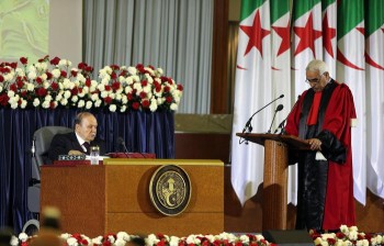 epa04183691 Algerian President Abdelaziz Bouteflika, re-elected for a fourth mandate, during the oath of office in Algiers, Algeria, 28 April 2014. Bouteflika was sworn in for a fourth term in a wheelchair. Bouteflika, who was reelected in April 17 elections, appeared stronger than in recent appearances but still fatigued as he took the oath of office in a televised ceremony at the Palais des Nations convention centre. The 77-year-old leader’s quest for another five years in office, despite being too weak to campaign after suffering a stroke last year, had divided Africa’s biggest gas producer. EPA/MOHAMED MESSARA
