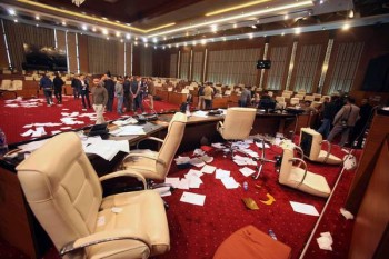 epa04108078 Libyans inspect the damage inside the General National Congress (GNC) one day after protesters stormed the building, in Tripoli, Libya, 03 March 2014. Dozens of Libyans on 02 March stormed the building of the parliament in the capital Tripoli in protest against the extension of its mandate. Parliament spokesman said demonstrators had set fire in the vicinity of the National Congress (parliament) before storming its hall while members were in session. EPA/SABRI ELMHEDWI