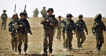 Israeli soldiers from the Nahal Infantry Brigade walk across a field near central Gaza Strip
