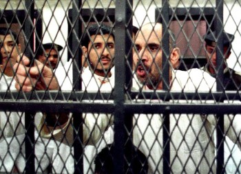 CAI01 – 19980202 – CAIRO, EGYPT : A member of the Moslem militant group Jamaa Islamiyya argues behind the bars of his jail, 02 February in Cairo. The Islamist is among a group of 65 suspected militants on trial here since 17 November. Most of them were arrested in 1993. EPA/AFP