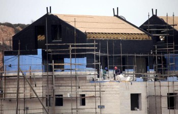 epa04058167 Palestinians work at construction sites as they build Israeli homes in the West Bank Jewish settlement of Efrat, south of Jerusalem and Bethlehem, 06 February 2014. Israel has authorized some additional 350 new homes in West Bank settlements near Jerusalem. EPA/ABED AL HASHLAMOUN
