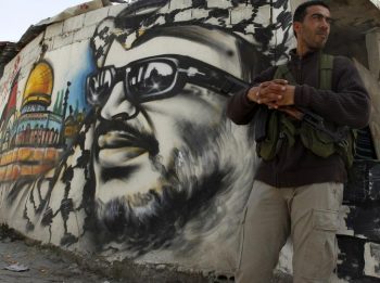 A gunman stands near a picture of late Palestinian leader Yasser Arafat at Ain al-Hilweh Palestinian refugee camp near the port city of Sidon