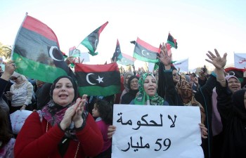 epa04232915 Libyan protesters hold placards and the national flags as they shout slogans during a demonstration in Tripoli, Libya, 30 May 2014. Libyans rally to ptotest against the presence of jihadist militias and in support of the ‘Operation Dignity’. The rally also commends the formation of a national army and police. EPA/SABRI ELMHEDWI