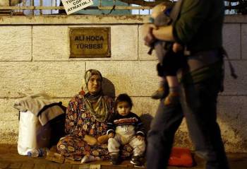 epa04494726 A Syrian refugee woman begs with her child while a tourist family walk on the street in Istanbul, Turkey, 18 November 2014. At least 9 million Syrians have fled from violence in their country after the start of an armed conflict in March 2011. According to the UN High Commissioner for Refugees (UNHCR), over 3 million of these refugees stay in Syria’s neighbours Turkey, Lebanon, Jordan and Iraq. 6.5 million others are displaced inside of Syria. EPA/SEDAT SUNA
