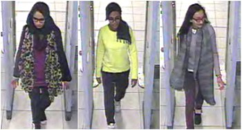 British teenage girls Shamima Begun, Amira Abase and Kadiza Sultana (L-R) walk through security at Gatwick airport before they boarded a flight to Turkey on February 17, 2015, in this combination picture made from handout still images taken from CCTV and released by the Metropolitan Police on February 22, 2015. British police launched an appeal on Friday to trace the three London schoolgirls who are believed to be making their way to Syria, having flown to Turkey earlier this week. The three friends, two aged 15 and one 16, left their east London homes on Tuesday and travelled to Gatwick airport where they caught a Turkish Airlines flight to Istanbul without telling their families. Police said they were working with Turkish authorities to try to find the girls and bring them home. CCTV footage shot on February 17. REUTERS/Metropolitan Police/Handout via Reuters (BRITAIN – Tags: CRIME LAW POLITICS TPX IMAGES OF THE DAY) ATTENTION EDITORS – THIS PICTURE WAS PROVIDED BY A THIRD PARTY. REUTERS IS UNABLE TO INDEPENDENTLY VERIFY THE AUTHENTICITY, CONTENT, LOCATION OR DATE OF THIS IMAGE. NO SALES. NO ARCHIVES. FOR EDITORIAL USE ONLY. NOT FOR SALE FOR MARKETING OR ADVERTISING CAMPAIGNS. QUALITY FROM SOURCE. THIS PICTURE WAS PROCESSED BY REUTERS TO ENHANCE QUALITY. AN UNPROCESSED VERSION WILL BE PROVIDED SEPARATELY