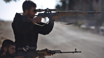 Syrian rebel snipers aim at Syrian army positions on the outskirts of Aleppo, Syria Wednesday, Nov. 14, 2012. (AP Photo/Khalil Hamra)