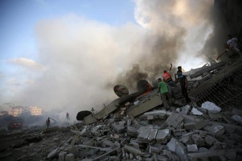 epa04329376 Palestinians inspect the rubble of a destroyed house after Israeli airstrikes in Al Tufah neighbourhood in eastern Gaza City, 24 July 2014. Palestinians say there are fewer and fewer safe places in Gaza to take shelter. The UN deems 44 per cent of the enclave to be unsafe for civilians. Dozens of Palestinians were killed 24 July on a bloody 17th day of an Israeli offensive in the Gaza Strip, officials said, as mediators tried to broker a five-day humanitarian truce. EPA/MOHAMMED SABER