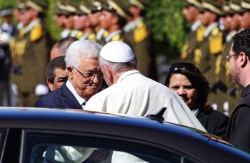 epa04223704 Pope Francis (R) is welcomed by Palestinian President Mahmoud Abbas as he arrives for a papal visit in the West Bank town of Bethlehem, 25 May 2014. Pope Francis arrived in the West Bank to start the most delicate part of his stay in the Middle East, with visits to the Palestinian Territories and Israel. EPA/ALAA BADARNEH