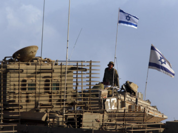 An Israeli soldier talks to a comrade, atop their armored personnel carrier at a staging area on the Israel Gaza border on Sunday, July 13, 2014. Israel briefly deployed ground troops inside the Gaza Strip for the first time early Sunday as its military warned northern Gaza residents to evacuate their homes, part of a widening offensive that has killed more than 160 Palestinians. (AP Photo/Lefteris Pitarakis)