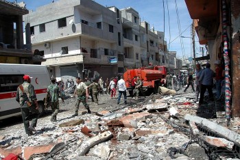 epa04185122 Syrian policemen and citizens inspect the damage at the site of a car bomb explosion in the Abbasid neighborhood, Homs province, Syria, 29 April 2014. The state news agency SANA said 36 people have been killed and 85 injured in a car bombing in a government-held area of the central Syrian city of Homs. EPA/STR