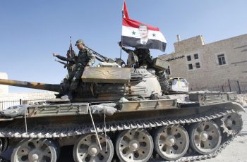Soldiers loyal to President al-Assad hold Syrian national flag, as they pass Mar Bacchus Sarkis monastery, at Maloula village, northeast of Damascus