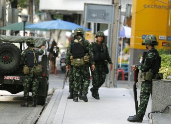 epa04214778 Thai armed soldiers patrol and stand guard outside the Shinawatra Tower Two in Bangkok, Thailand, 20 May 2014. Thai army Chief Prayuth Chan-ocha early on 20 May 2014, declared martial law giving the military full control to prevent further protest-related violence in the country. The statement was issued about 3 am on 20 May (2000 GMT), according to local media reports. Prayuth has the authority to declare martial law without the consent of the government, which has had caretaker status since 09 December 2013. Thailand has been wracked by six months of non-stop protests seeking to topple the government. At least 25 people have died in political-related violence and more than 700 injured. EPA/NARONG SANGNAK