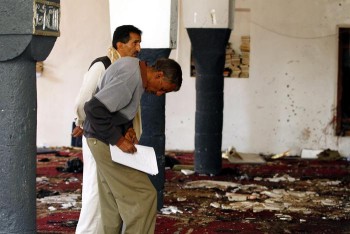 epa04671593 Forensic experts inspect the scene of a suicide attack targeting the al-Hashahush mosque in Sanaa, Yemen, 20 March 2015. According to reports at least 88 people were killed and many more wounded when one attacker blew himself up inside the Badr mosque in southern Sana’a then another detonated at the mosque’s main entrance as worshippers tried to flee, a third explosion targeted the al-Hashahush Mosque in the north of Sana’a. EPA/YAHYA ARHAB EPA/YAHYA ARHAB