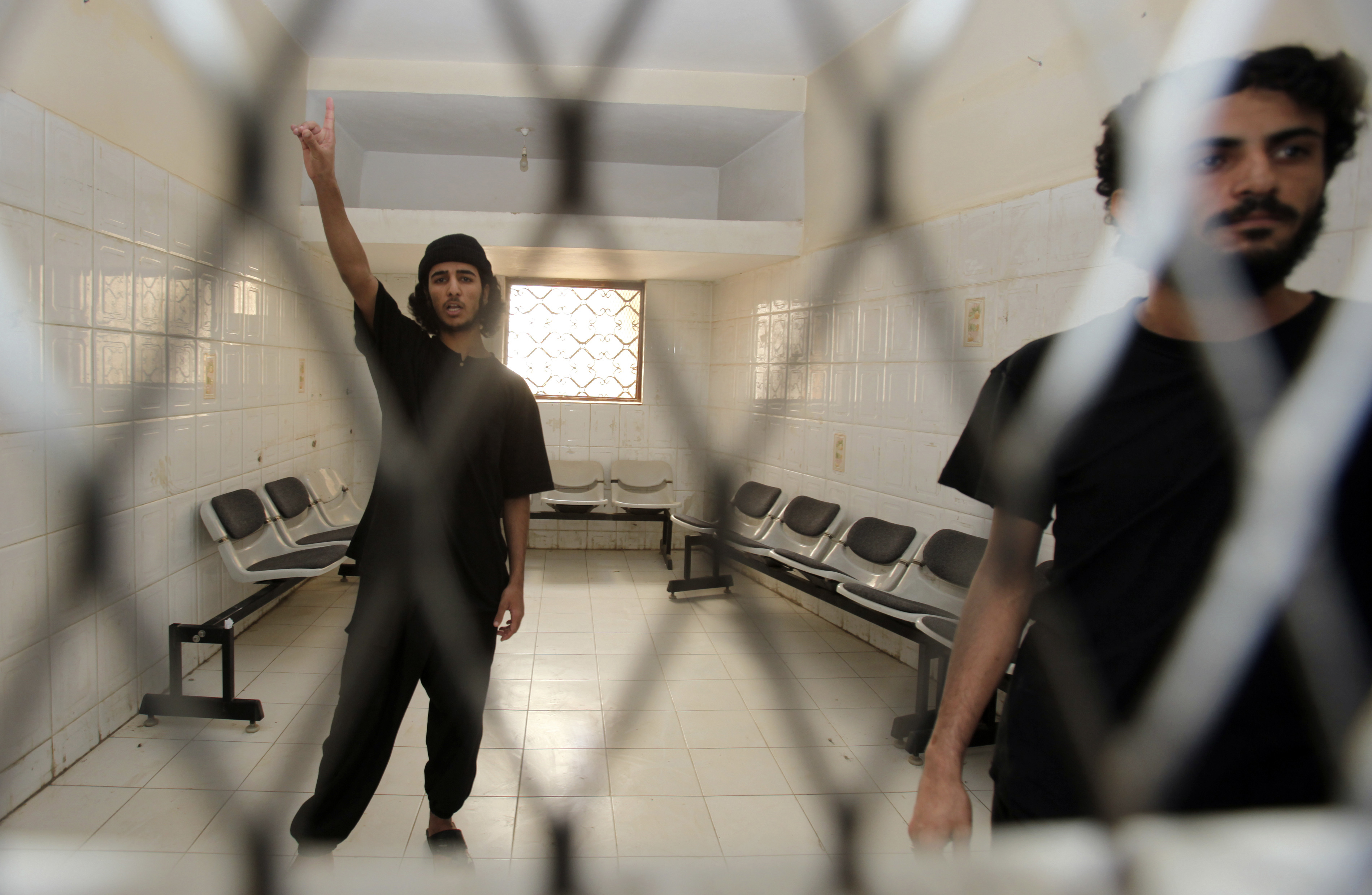 Mansour Dalil (L), an al-Qaeda suspect, reacts after a verdict was announced at a state security court sentencing him to death in Sanaa July 7, 2010. The court on Wednesday sentenced Dalil and co-defendant Mubarak al-Shabwani (R) to death for killing senior security officers in attacks last year. REUTERS/Khaled Abdullah (YEMEN – Tags: POLITICS CRIME LAW)